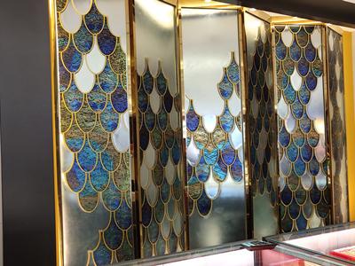 我們再來整體看一下這款不銹鋼屏風(fēng),其外框和內(nèi)框小水滴的邊框都是采用不銹鋼材料制作,并鍍鈦金色,然后與發(fā)光石的藍色,紫色,黃金色等搭配在一起,看起來既具有時尚美感,又具有現(xiàn)代氣息。你說這樣一款珠寶店鈦金不銹鋼屏風(fēng)安裝在店內(nèi),能不吸引人嗎?